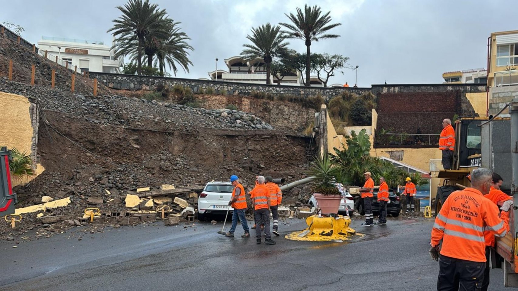 Los operarios municipales han actuado en el adecentamiento de la calle Las Margaritas, Altos del Gloria Palace, Paseo Costa Meloneras y Avenida de Colón, donde se han retirado residuos, restos vegetales y barro. Canaragua está inspeccionando nuevamente la red de alcantarillado. Los efectivos de las concejalías de Vías y Obras y de Parques y Jardines ya han entrado en la fase final de la limpieza del muro caído en el Anexo II y en el aseguramiento dela zona, y también han actuado incluso con tractor en la limpieza y aseguramiento de accesos en Taidía y Montaña de Rosiana, y en la limpieza de cunetas para asegurar las vías de las medianías del municipio. También Ecoparque de Juan Grande ha colaborado activamente en esta situación de alarma con los servicios municipales en la retirada y gestión de los escombros del muro colapsado.
